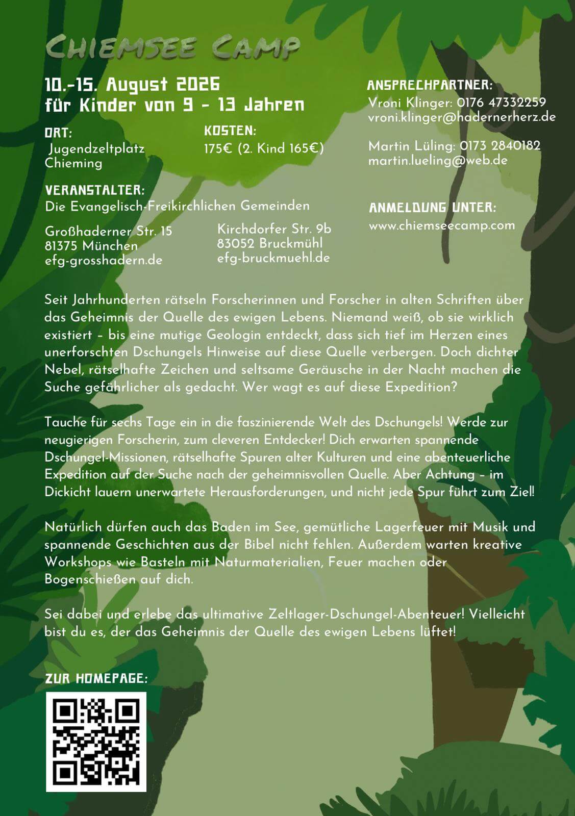 Rund 30 Mitarbeiter und Mitarbeiterinnen investieren alle Kreativität und Herzblut um 80 Kindern einen unvergesslichen Sommer zu bereiten. Parallel zu einer packenden Lagerstory, werden wir biblische Geschichten neu kennenlernen, viel Action rund um unser tolles Gelände am Chiemsee erleben und abends am Lagerfeuer mit Blick auf den See chillen.
